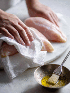 Step 2: Pat the chicken breasts dry with paper towels. This helps the seasoning stick.