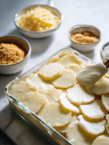 5. Spread a thin layer of the cheese sauce on the bottom of your prepared baking dish. Arrange a layer of potato slices over the sauce, then spoon more sauce over these slices, repeating until all potatoes are layered, ending with a generous pour of sauce on top.