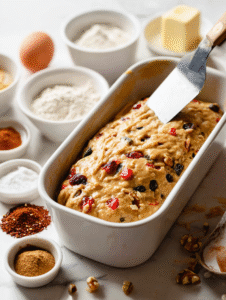 - Pour the batter into your prepared loaf pan, smoothing the top with a spatula. The batter should fill the pan evenly.