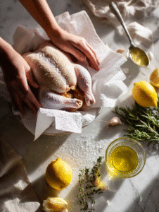 - Truss the legs with kitchen twine to ensure even cooking and neat presentation.