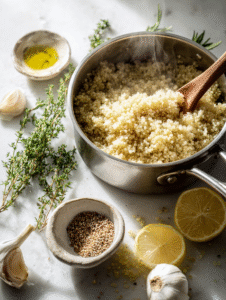 Step 7: Meanwhile, prepare the herb-infused quinoa stuffing: sauté chopped herbs and garlic, then fold into cooked quinoa.