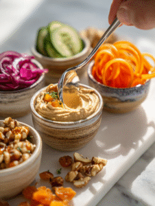 - Place small bowls filled with smoked hummus and any additional spreads or dips onto the board, positioning them to create visual balance.