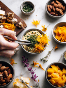 Step 4: Finish by scattering fresh herbs, edible flowers, or zest for a pop of color and aroma.