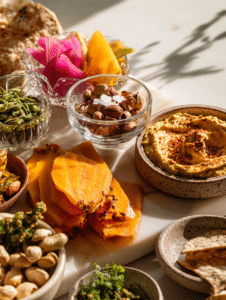 Step 3: Add small bowls for dips or spreads—perhaps a smoky hummus or a sweet-tangy chutney.