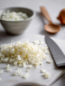 - Start by chopping the onion and mincing the garlic, preparing them for sautéing.