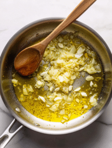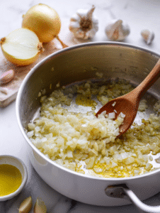 - Heat a large pot over medium heat and add olive oil. Once shimmering, add the chopped onion and minced garlic, sautéing until fragrant and translucent, about 5 minutes.