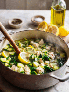 Step 6: Add chopped vegetables—celery, zucchini, and spinach—to the broth. Simmer 10 minutes until tender. Taste and adjust salt and pepper. Return shredded chicken to the pot, heat through for 5 minutes.