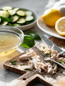 Step 5: Remove the chicken, shred it with two forks, and set aside. Meanwhile, check the broth; it should smell rich and savory, with a hint of garlic.