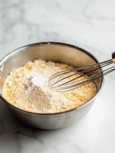 - Prepare the batter by whisking together the cornmeal, flour, sugar, baking powder, salt, and pepper in a mixing bowl until evenly combined.