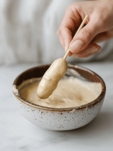 - Insert each mini hot dog into a skewer or hold them carefully, then dip them one by one into the batter, ensuring they are fully coated with a thick layer of batter.