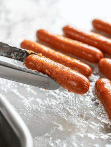 - Carefully lower the battered hot dogs into the hot oil using tongs, placing them in a single layer to avoid overcrowding.