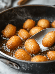 - Fry the corn dog bites for about 3–4 minutes, turning occasionally, until the batter is golden brown and crispy.