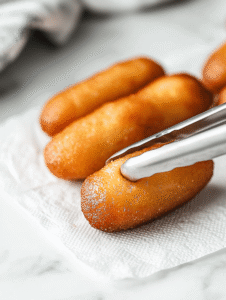 - Use tongs to remove the cooked corn dogs from the oil and place them on paper towels to drain any excess oil.