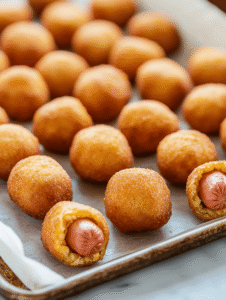 - Let the corn dog bites rest for a minute to cool slightly; the batter will firm up to a crunchy texture while the hot dog remains tender inside.