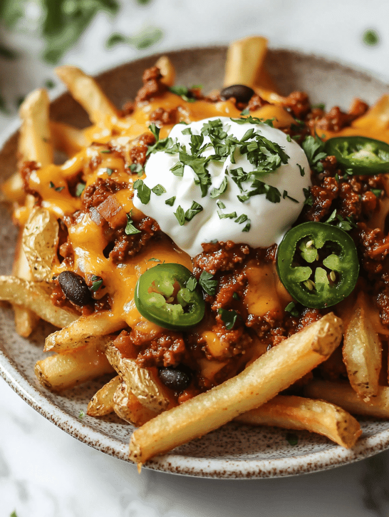 Cheesy Chili Fries with Jalapeños and Sour Cream