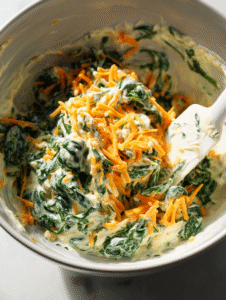 3. Stir in the grated cheese and chopped spinach, folding gently until evenly combined.