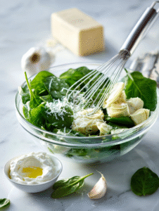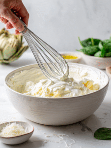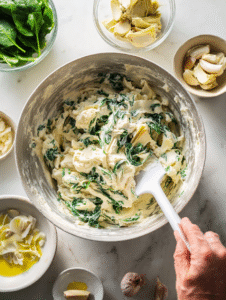 - Gently fold in the chopped spinach, artichokes, and minced garlic into the cheese mixture using a silicone spatula.