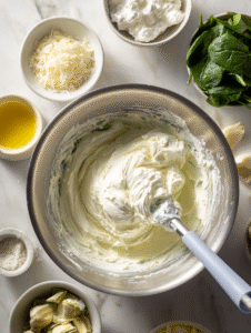 Step 4: Mix softened cream cheese, sour cream, and grated Parmesan in a bowl until smooth.