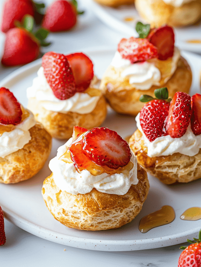 Years ago, my grandma’s kitchen was filled with the sweet, creamy scent of vanilla and the tang of ripe strawberries. I’ve always loved how cream puffs retain that delicate, airy crunch while enveloping a luscious filling. This recipe takes that nostalgic treat and adds a surprise element—a hint of floral honey infused into the whipped cream.