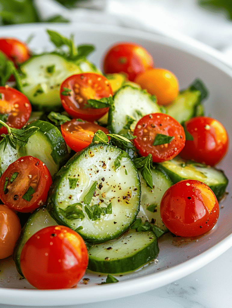 This salad combines crisp cucumber, juicy tomato, and pungent onion, tossed with fresh herbs and a lemon-based dressing. It has a bright, crunchy texture with a tangy, herbaceous flavor profile, ideal for hot days and casual gatherings.