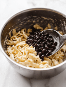 - Add the drained pasta and rinsed black beans to the bowl with the dressing. Toss gently to coat all the ingredients evenly—you should see the pasta glistening and beans distributed throughout.