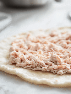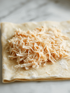 - Spread the shredded turkey evenly over the pastry or tortilla sheet, leaving a small border around the edges.
