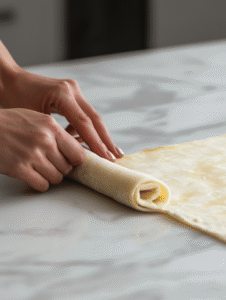 - Gently roll up the pastry or tortilla from one edge to the other, creating a tight log, and seal the edges.
