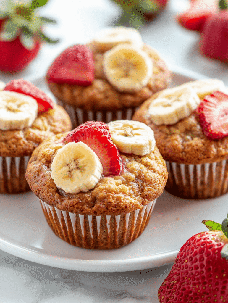 These muffins are made with mashed bananas and chopped strawberries mixed into a moist batter, then baked until golden and tender. The result is a soft, light muffin with visible fruit pieces, offering a sweet and fruity flavor profile and a fluffy texture.