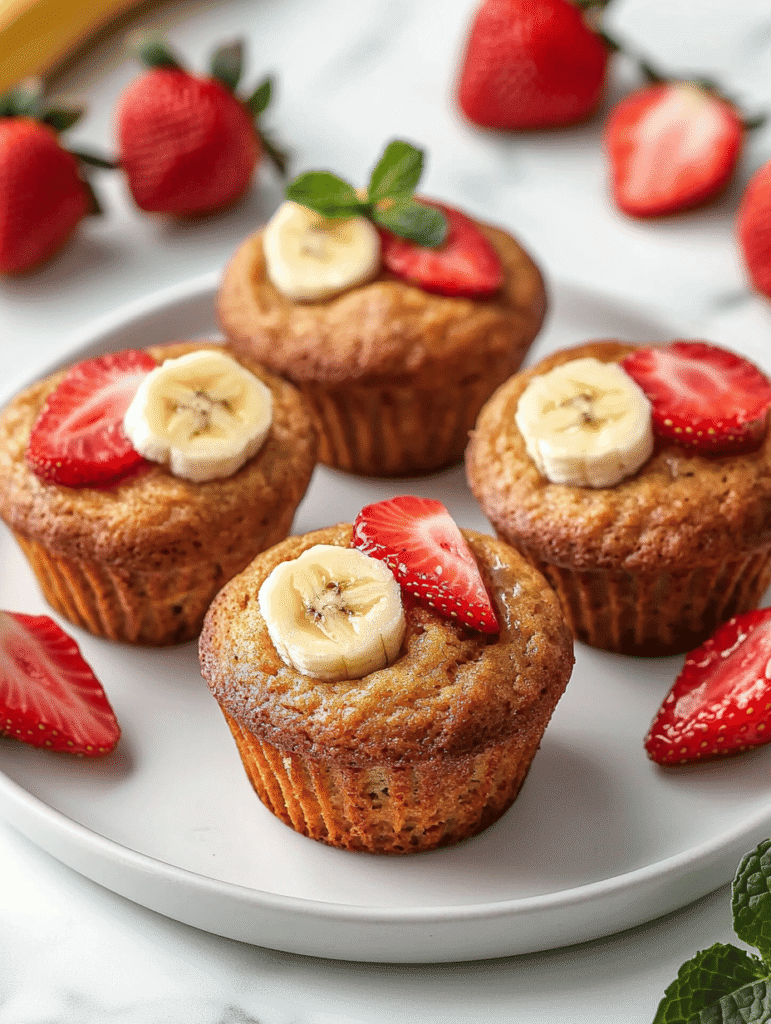 These muffins are made by folding ripe mashed bananas and chopped strawberries into a batter, then baking until golden with a moist, tender crumb. The final texture features a soft interior with bursts of juicy fruit, crowned with a slightly crispy top.
