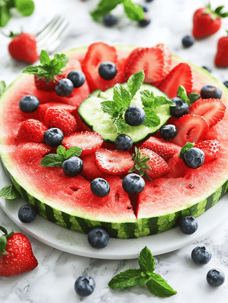 6. Decorate the top and sides of the watermelon cake with fresh berries, sliced kiwi, citrus segments, or mint leaves for added color and flavor.