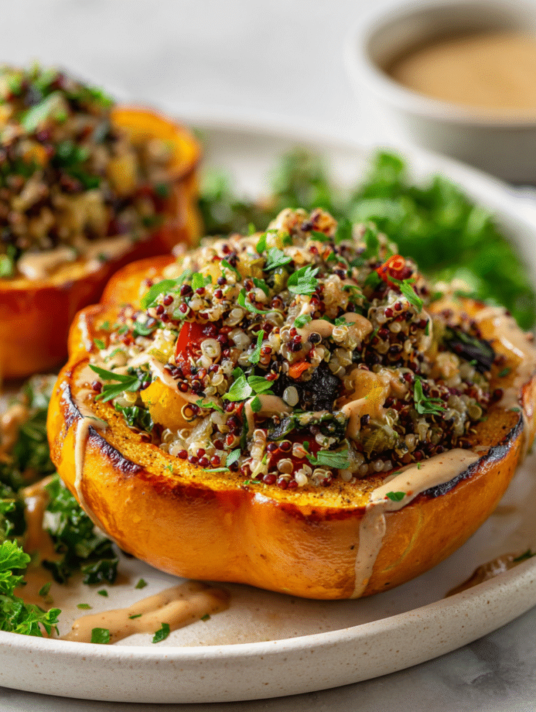This vegan stuffed squash dish features halved, roasted squash filled with a hearty mixture of quinoa, black beans, fresh herbs, and warm spices. The roasting process creates a caramelized exterior, while the filling offers a tender, flavorful bite with crunchy toasted nuts on top. It’s a cozy, festive presentation perfect for celebrating fall harvest flavors.